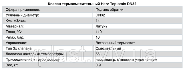 Клапан трьохходовий термозмішуючий Herz Teplomix для підвищення температури зворотної лінії котельного обладнання, c відключається байпасом, температура потоку близько 55 °С. Отвір з заглушкою 3/8 для видалення шламу. Максимальна температура експлуатації 110 °С.